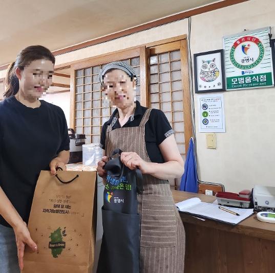 광명시는 지난 3일부터 4일까지 ‘남은 음식 재사용 안하기’를 실천하는 관내 모범음식점 45곳에 다회용 앞치마를 배부하며 지원했다.이번 지원은 기후변화 대응과 탄소중립 실천을 위해 일회용품 사용을