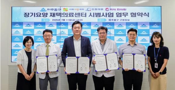 인천 미추홀구는 11일 구청장실에서 ‘장기요양 재택의료센터 시범 사업’ 추진을 위해 지역 의료기관인 서해사랑내과의원(대표 박근호), 인천의원(대표 김청기), 학익한의원(대표 황병천)과 업무협약을 체