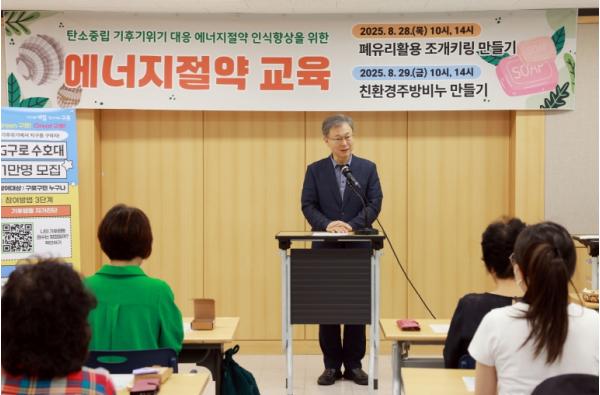 구로구가 28일 구청 신관 평생학습관에서 구민들을 대상으로 ‘에너지 절약 교육’을 실시했다. 이번 교육은 탄소중립 실천과 기후위기 대응을 위해 마련된 프로그램으로 이날은 ‘폐유리 활용 조개 키링