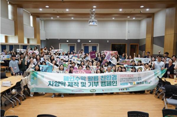 서울시평생교육진흥원은 서울시자원봉사센터 청년기획봉사단 ‘기후훗’과 함께 폐현수막을 업사이클링해 친환경 차양막으로 재탄생시키고, 11일 서울시립강동청소년센터에 기부·설치했다. 폭염이 이어지는