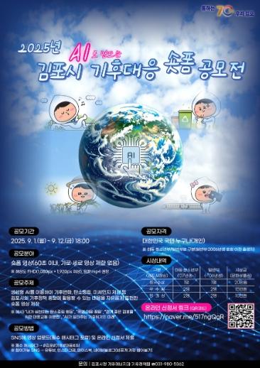 김포시가 시민들의 기후변화와 탄소중립에 대한 관심과 이해를 높이고, 미래세대의 디지털 역량과 환경 감수성을 함양하기 위해 '2025년 김포시 인공지능(AI)으로 만드는 기후대응 숏폼 공모전'을 개최한다