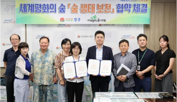 인천시 중구가 영종국제도시 지역 대표 녹색복지 공간인 ‘세계평화의 숲’의 생태 보전을 위해 ‘세계평화의숲사람들’과 손을 맞잡았다. 김정헌 인천 중구청장과 이기혜 세계평화의숲사람들 대표는 지난 3