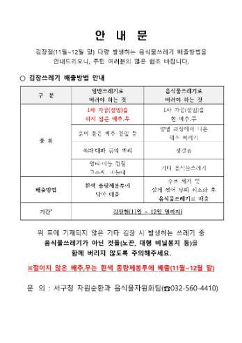 인천 서구는 김장철 ‘김장쓰레기’를 원활히 처리하기 위해 11월부터 12월 말까지 한시적으로 일부 김장쓰레기에 대하여서만 생활폐기물 일반 규격 봉투 배출을 허용한다. 일반 생활쓰레기 종량제봉투에 배