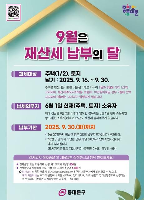 서울 동대문구는 9월 정기분 재산세를 납세의무자에게 부과‧고지했다고 16일 밝혔다.재산세는 매년 6월 1일을 기준으로 부동산 등을 소유한 사람에게 매년 7월과 9월 두 차례 나누어 부과된다. 7월에는 주