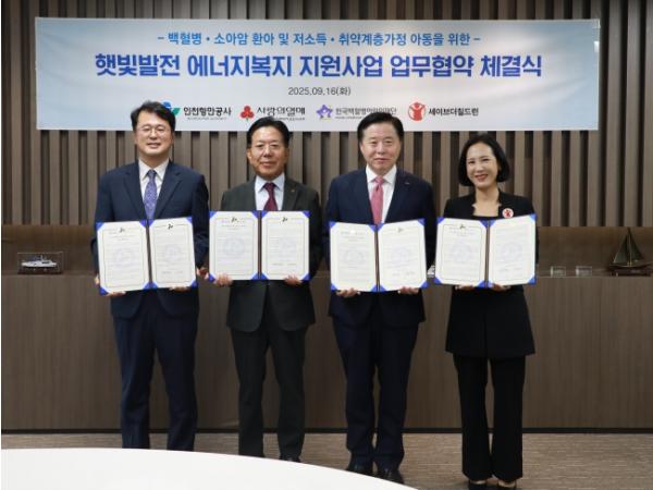 인천항만공사는 16일 인천항 태양광발전소 발전수익의 사회 환원을 위한 ‘햇빛발전 에너지복지 지원사업 협약’ 체결식을 개최했다고 밝혔다. 이번 협약은 인천항 내 태양광발전소 운영을 통해 발생한 수익