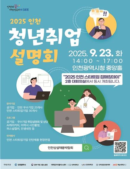 인천광역시는 오는 9월 23일 시청 중앙홀에서 ‘2025 인천 청년 취업설명회’를 개최한다고 밝혔다. 이번 행사는 청년들에게 공기업·민간기업·신생기업(startup) 등 다양한 취업 기회를 제공하기 위해 마련