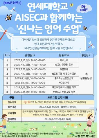 서울 은평구는 구립 은뜨락도서관에서 연세대학교 사회활동 동아리 아이섹(AIESEC)과 함께 ‘신나는 영어 수업’ 프로그램을 내달 14일까지 운영한다고 밝혔다.