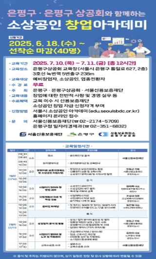 창업아카데미는 예비 창업자 등에게 창업에 관한 전반적인 사항과 경영 실무 등을 알려주기 위한 것으로, 은평구와 은평구상공회 그리고 서울신용보증재단이 공동으로 개최한다. 교육은 은평구상공회교육장에서 진행된다.