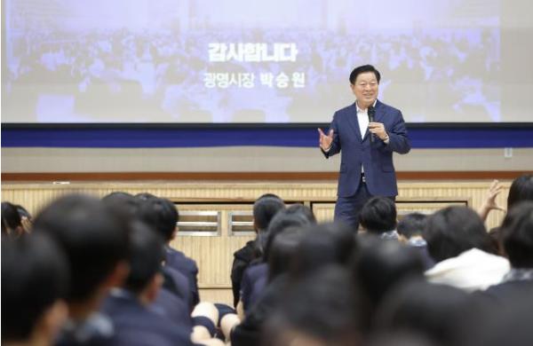 박 시장은 지난 15일 오후 하안북중학교를 찾아 ‘2025년 찾아가는 청소년 자치분권교실’의 특별강사로 나서 2학년 학생 320여 명에게 자치분권에 대해 알기 쉽게 설명했다.