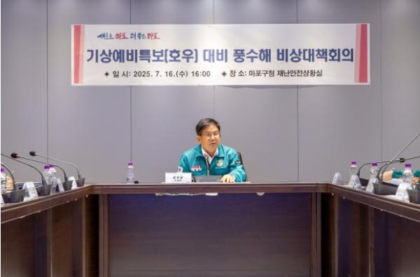 마포구는 7월 16일 오후 4시, 기상청의 서울지역 호우 예비특보 발령에 따라 마포구청 재난안전상황실에서 풍수해 대비 비상대책회의를 긴급 개최했다.