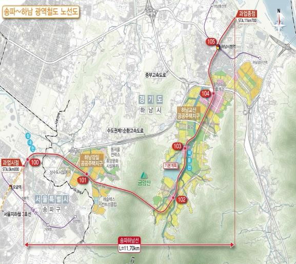 정거장은 송파구 1개소(100정거장), 감일신도시 1개소(101정거장), 교산신도시 3개소 (102~104정거장), 원도심 1개소(하남시청역)로 총 6개소가 계획됐다.