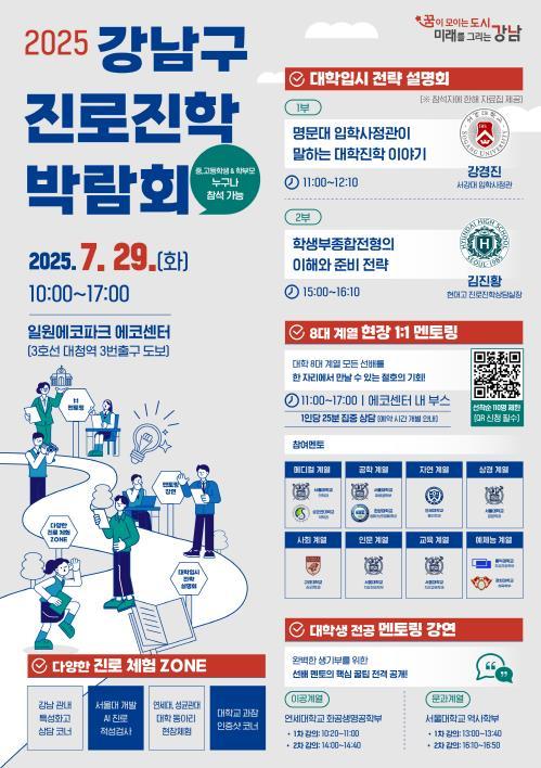 꿈이 모이는 도시, 미래를 그리는 강남구가 단국대학교부속소프트웨어고등학교와 함께 7월 29일 오전 10시부터 오후 5시까지 일원에코파크 에코센터에서 중·고등학생과 학부모를 위한 ‘진로·진학 박람회’를 개최한다.