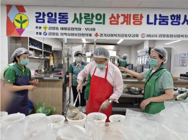 하남시 감일동은 25일 초복을 맞이하여 새마을협의회·부녀회가 주관하고 감일종합사회복지관의 후원으로 감일동 취약계층 어르신 70가구를 대상으로“사랑의 삼계탕 나눔 행사”를 실시했다.