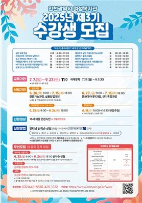인천광역시 여성복지관은 오는 6월 23일부터 2025년도 제3기 사회교육강좌 수강생을 모집한다고 밝혔다.