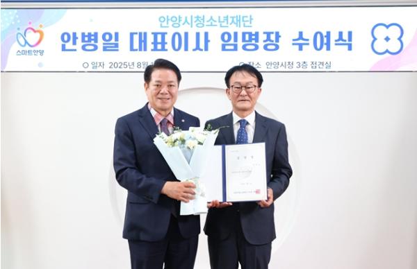 최대호 이사장은 1일 시청 접견실에서 안병일 대표이사에게 임명장을 수여하고 “청소년이 행복하고 안전한 ‘지속가능한 청소년 행복 성장도시 안양’ 조성을 위해 안양시 청소년 정책 수행 허브 기관으로서 역할을 다 해달라” 고 당부했다.