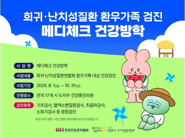 KH한국건강관리협회는 8월 1일부터 10월 31일까지 (사)한국희귀난치성질환연합회(회장 김재학, 이하 연합회)와 함께 환우 가족을 위한 맞춤형 종합검진 프로그램인‘메디체크 건강방학’을 실시한다.