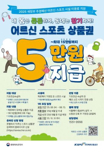 지원 대상은 관내 만 65세 이상 기초연금 수급자로, 오는 13일까지 1차 모집을 진행한다. 포털사이트에서 ‘어르신 스포츠 상품권’을 검색하거나 전용 누리집을 통해 신청할 수 있다. 대상자로 선정되면 2025년 9월부터 제로페이로 5만 원씩 지원받게 되며 2025년 10월 31일까지 제로페이 가맹 체육시설에서 사용할 수 있다.