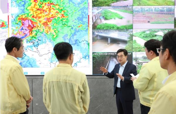 경기도가 13일 오전 4시 30분부로 호우 대비 재난안전대책본부 비상 1단계를 발령한 가운데 김동연 경기도지사가 경기도 재난안전대책본부를 찾아 호우 피해상황을 살펴보고 대응체계를 점검했다.