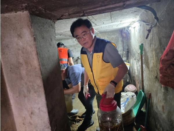 진교훈 서울 강서구청장이 14일 극한 폭우로 피해를 입은 방화동 일대 수재민 가구를 찾아 복구작업에 팔을 걷었다.