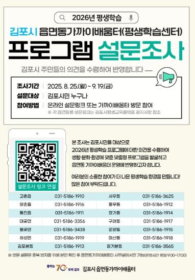 설문 참여는 김포시 평생교육 통합플랫폼 홈페이지를 통해 가능하며, 기타 사항은 읍면동 가까이배움터 또는 김포시 민원콜센터로 문의하면 된다.