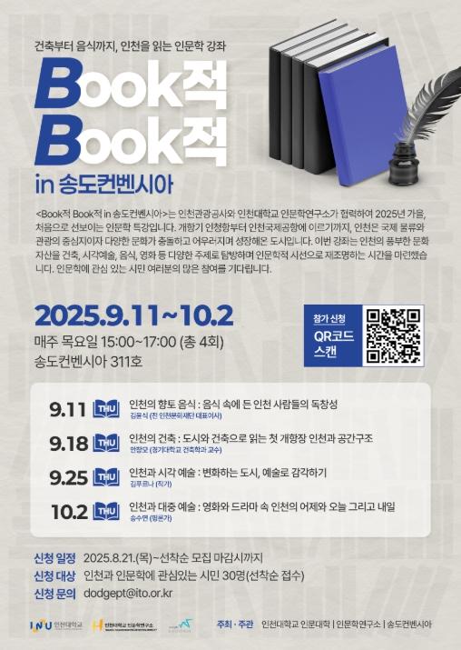 인천광역시경제자유구역청과 인천관광공사는 오는 8월 21일부터 시민 인문학 강좌 ‘Book적 Book적 in 송도컨벤시아’의 참가 신청 접수를 받는다고 밝혔다. 이번 강좌는 인천관광공사와 인천대학교 인문학연구소가 협력해 진행하는 시민 특강으로, ‘인천관광 열린혁신 아이디어 공모’에서 시민이 제안한 아이디어를 바탕으로 기획됐다.