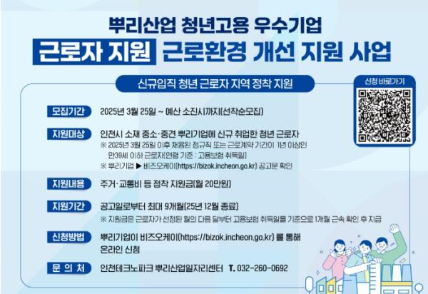 인천테크노파크(인천TP)와 인천시는 뿌리산업의 청년 고용을 촉진하고 근로자의 정주 여건을 개선하기 위해 ‘2025년 청년 고용 우수기업 근로환경개선 지원사업(정착지원)’의 참여기업을 모집한다고 밝혔다.