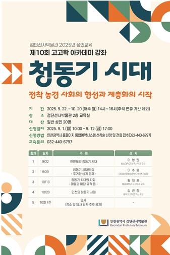 인천광역시 검단선사박물관은 9월 22일부터 10월 20일까지 성인을 대상으로 제10회 선사시대(고고학) 아카데미 ‘청동기 시대 – 정착 농경 사회의 형성과 계층화의 시작’을 운영한다고 밝혔다.