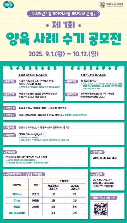 공모전은 ‘2025년 경기아이사랑부모학교 운영사업’의 하나로 마련됐다. ‘경기아이사랑 부모학교 운영’은 양육에 관심 있는 도민을 대상으로 1:1 양육 상담과 맞춤형 교육을 제공하는 사업이다.