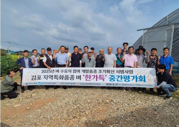 김포시농업기술센터는 지난 8월 27일 통진읍 도사리 일원에서 ‘벼 수요자 참여 개발품종 조기확산 시범사업’의 일환으로 농업인 및 관계자 30여 명이 참여한 가운데 김포 지역특화 벼 신품종인 ‘한가득’의 중간평가회를 실시했다.