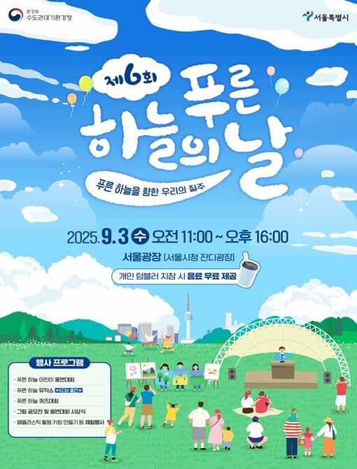 서울시는 환경부 소속 수도권대기환경청과 함께 9월 3일 서울광장에서 11시부터 16시까지 ‘제6회 푸른 하늘의 날’ 수도권 지역 행사를 개최한다.