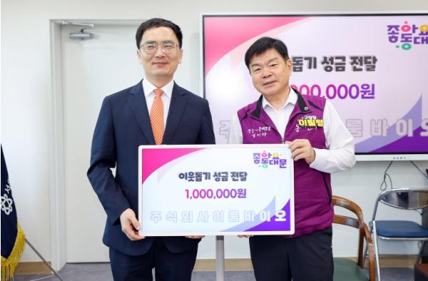 서울 동대문구는 9월 3일 ㈜이룸바이오(대표 조진형)로부터 지역 내 어려운 이웃을 위한 성금 100만 원을 기탁받았다고 밝혔다.