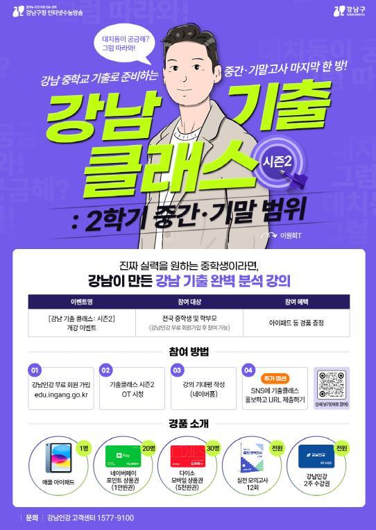 꿈이 모이는 도시, 미래를 그리는 강남구가 운영하는 강남인강이 중학생을 대상으로 하는 ‘강남 기출 클래스 시즌2’ 개강에 맞춰 오는 9월 8일부터 21일까지 개강 기념 이벤트를 연다.