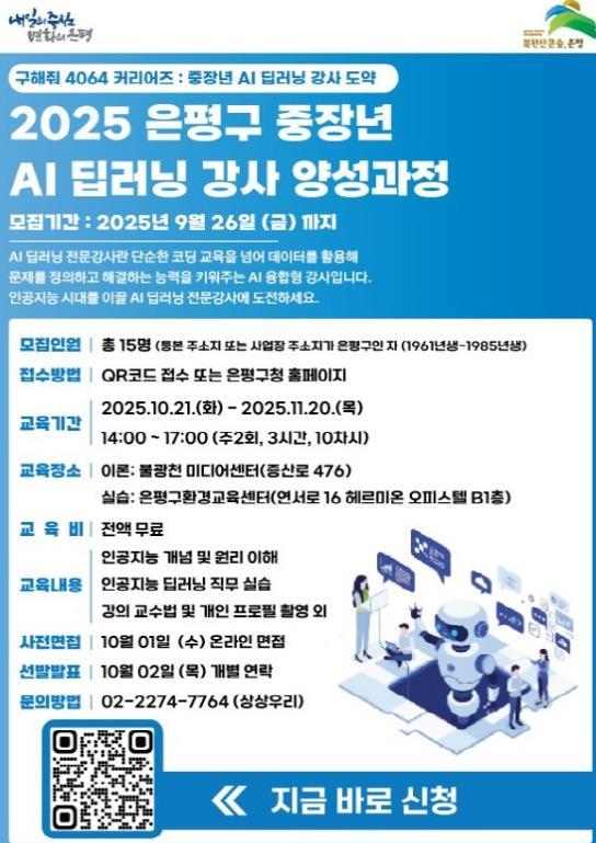 서울 은평구는 중장년층의 경력전환과 창직(創職)을 지원하기 위해 ‘구해줘 4064 커리어즈 시즌2: AI 인공지능(딥러닝) 교육 전문가 양성과정’ 참여자를 모집한다고 밝혔다.