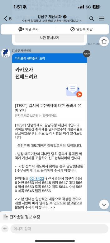 알림톡 발송 대상은 ▲일시적 2주택자 ▲생애 최초 주택 구입자 ▲무상취득자 ▲부동산 상속자 등 네 가지 유형이다. 구는 지난 9월 2일과 3일 이틀간 420명에게 첫 안내 메시지를 발송했다.