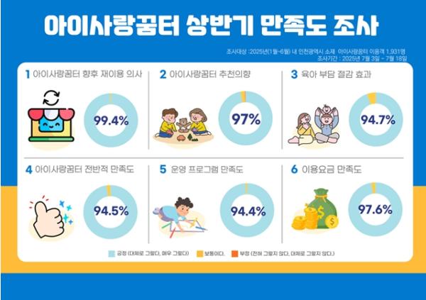 인천여성가족재단은 ‘아이사랑꿈터’ 2025년 상반기(1월~6월) 이용자들을 대상으로 실시한 2025년 상반기 만족도 조사에서 아이사랑꿈터 재이용 의사가 99.4%로 나타났으며, 더불어 전 항목에서 94% 이상의 높은 만족도를 기록했다고 10일 밝혔다.