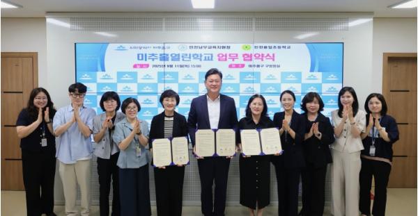 인천 미추홀구는 11일 구청장실에서 인천남부교육지원청, 인천용일초등학교(교장 김수경)와 함께 용일초 다목적 강당 주민개방을 위한 ‘미추홀열린학교 업무협약’을 체결했다.