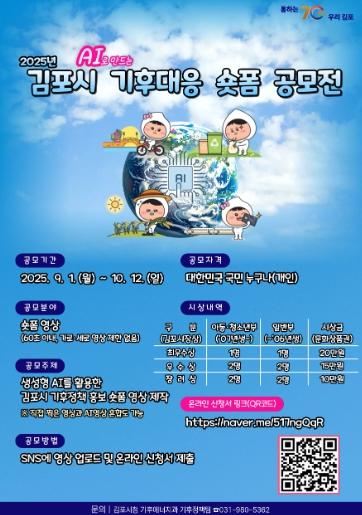 김포시는 시민들의 기후변화와 탄소중립에 대한 관심과 이해를 높이고, 미래세대의 디지털 역량과 환경 감수성을 함양하기 위해 개최하는 '2025년 김포시 인공지능(AI)으로 만드는 기후대응 숏폼 공모전'의 접수 기간을 연장한다고 9월 11일 밝혔다.