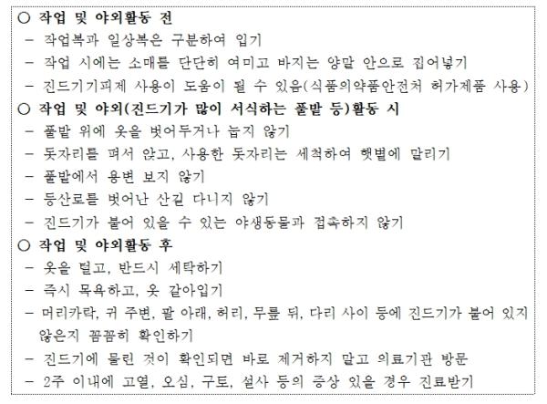 김명길 감염병연구부장은 “주말농장, 등산, 제초작업, 골프 등 야외 활동 시에는 기피제를 사용하고 긴 소매·긴 바지·장갑 등으로 피부 노출을 최소화해야 한다”며 예방 수칙을 강조했다.