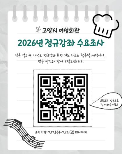 고양특례시 여성회관에서 내년도 정규강좌 프로그램 개설을 위한 시민 대상 희망 강좌 설문조사를 실시한다고 17일 밝혔다.