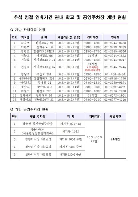서울 동대문구는 추석 연휴를 맞아 주민과 방문객, 역귀성객 등의 주차 편의를 돕기 위해 10월 3일부터 9일까지 7일간 관내 학교 및 공영주차장 18개소를 무료로 개방한다고 밝혔다.