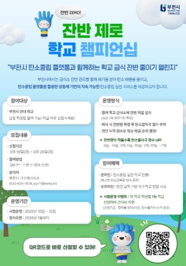 부천시는 9월 19일부터 26일까지 ‘잔반제로 학교 챔피언십’ 참가학교 신청을 받는다. 관내 모든 학교가 신청할 수 있으며, 이번 사업은 학교 급식소의 음식물 잔반을 줄이고 폐기물 분야 온실가스 배출을 낮춰 탄소중립을 실현하기 위해 마련됐다.