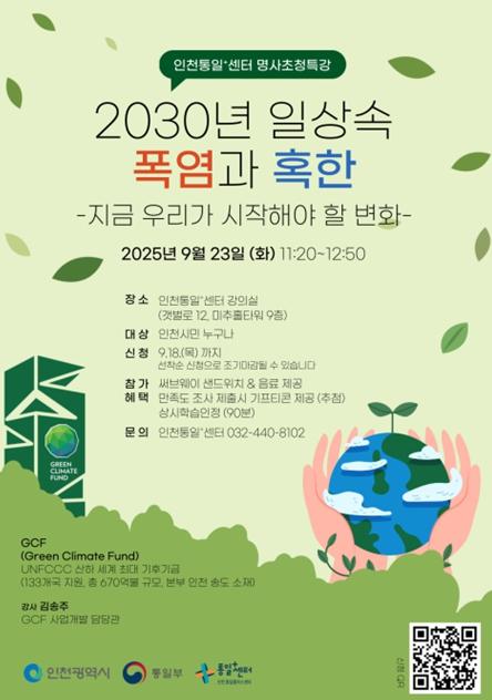 인천광역시는 9월 23일 인천통일플러스센터(연수구 송도동 소재)에서 녹색기후기금(GCF)의 전문가를 초청, 기후위기의 심각성과 대응방안을 주제로 하는 특별 강연을 개최했다고 밝혔다.