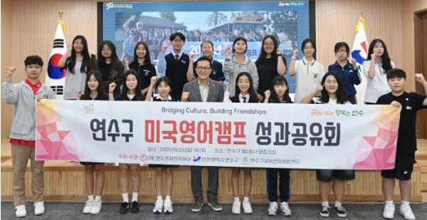연수구는 지난 22일 연수구 제2청사에서 ‘연수구 미국영어캠프’ 성과공유회를 개최해 참가 장학생들의 학습 성과와 글로벌 경험을 함께 나누는 자리를 마련했다.