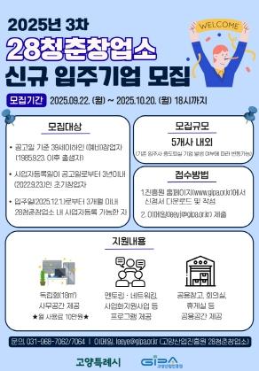 고양특례시가 조성하고 고양산업진흥원이 운영하는 ‘28청춘창업소’가 10월 20일까지 3차 신규 입주기업을 모집한다.