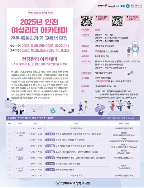 인천광역시는 역량 있는 여성 인재를 발굴하고 육성하기 위해 인하대학교 평생교육원과 함께 ‘2025 인천 여성리더 아카데미’ 두 번째 전문・특화과정인 ‘건강관리 아카데미’ 교육생을 모집한다고 밝혔다.