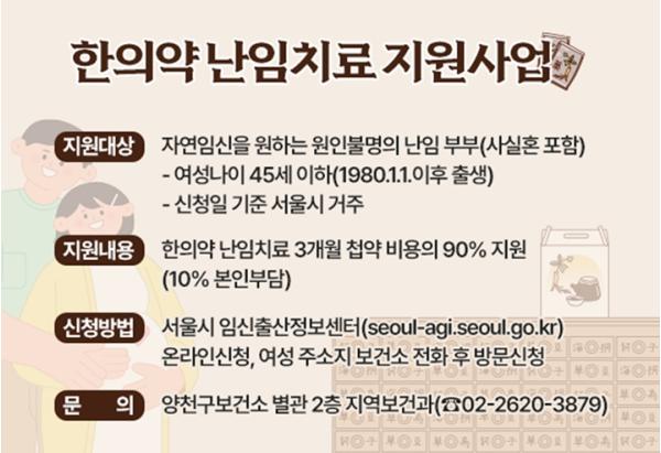 구는 저출산 위기 극복과 난임부부의 경제적 부담 완화를 위해 양천구 한의사회와 함께 ‘한의약 난임치료 지원사업’을 운영하고 있다.