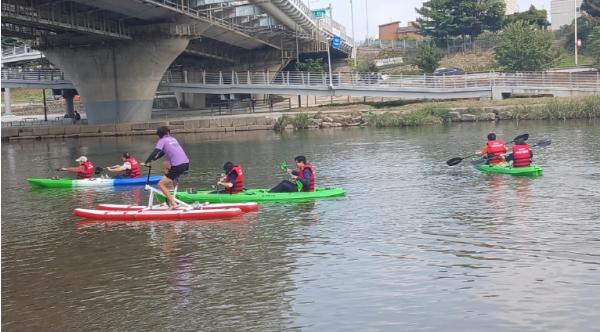 서울 동대문구는 30일 이문수변공원 내 수상스포츠체험교육장에서 시각장애인 대상 카약 체험을 진행했다고 밝혔다.