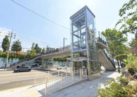 이에 구는 정밀안전진단을 실시하고 노후된 보도육교의 시설개선과 승강기 설치에 필요한 예산을 확보해 지난해 9월부터 보수공사를 본격 추진했다. 낡은 계단은 철거하고 보도육교 양편에 승강기 2대를 신설했으며, 육교 전면(397㎡)을 새로 도장하고 상부 교면은 탄성포장재로 재포장하는 등 육교의 기능과 편의성을 향상시키기 위한 전반적인 시설 개선이 이뤄졌다.