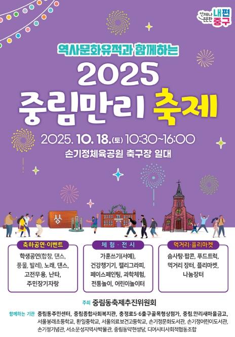 서울 중구는 중림동 손기정체육공원 축구장 일대에서 오는 18일(토) 오전10시부터 오후6시까지‘2025 중림만리 축제’가 열린다고 밝혔다.