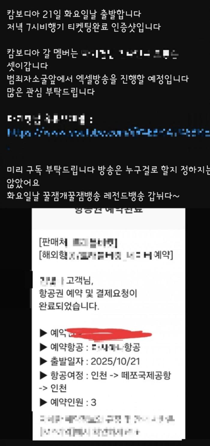 온라인 커뮤니티에 따르면 한 BJ는 “범죄자 소굴 앞에서 엑셀방송을 하겠다”며 21일 캄보디아로 출국한다고 SNS를 통해 밝혔다. 그는 BJ·유튜버 등 총 3명과 동행할 예정으로 알려졌다. ‘엑셀방송’은 후원자 순위를 실시간으로 정리해 경쟁을 유도하는 형태로, 자극적 내용을 통해 조회수를 끌어올리는 방식이다.
